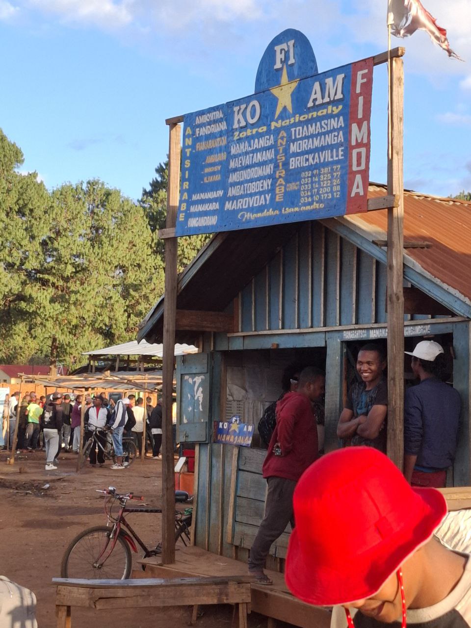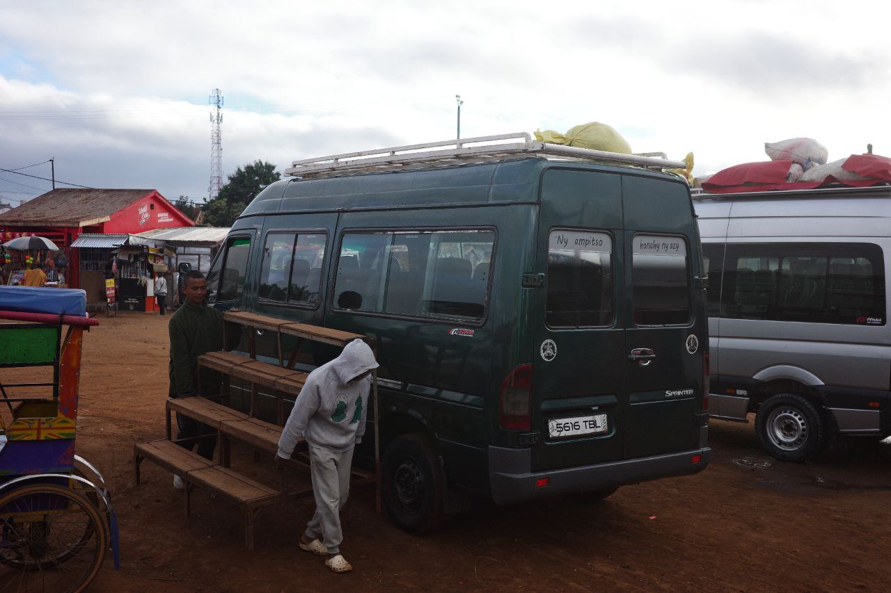 講了我們要去拉努馬法納之後,我就被帶到其中一家的櫃台。那家的主力路線是做安齊拉貝到菲亞那蘭楚阿以及更南邊的城市間交通。櫃台的大哥操著還算能溝通的英文跟我們解釋路線:沒有任何一台車會從安齊拉貝直接上拉努馬法納村,所有搭法都得要先到菲城,再轉搭另一班小巴回頭上山。最後我們跟他用一個位子 45000 Ar 的價格訂了三個直達拉村的位子,想說這樣讓兩個包包佔一個位子會舒適一點。